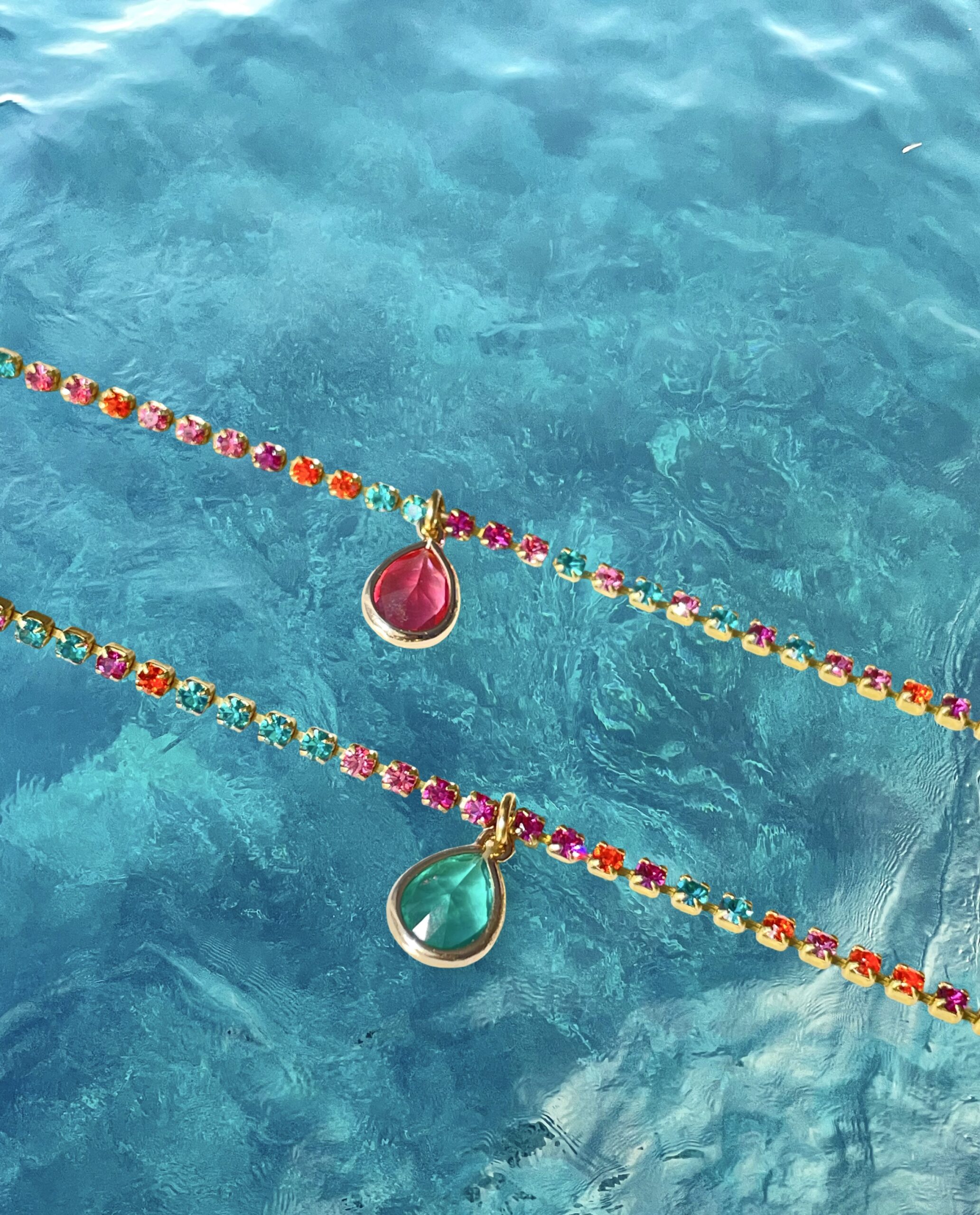 Une chaîne en strass multicolore et un éclatant pendentif rose ou bleu, selon votre convenance.
