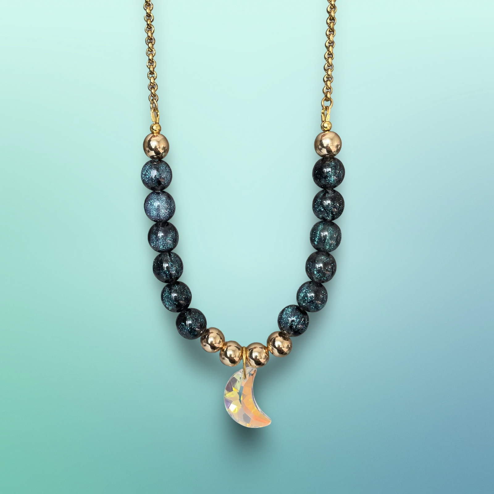 C’est le collier qu’il vous manquait : avec ses perles bleu paillettes et son pendentif en verre lune, il est l’accessoire parfait.